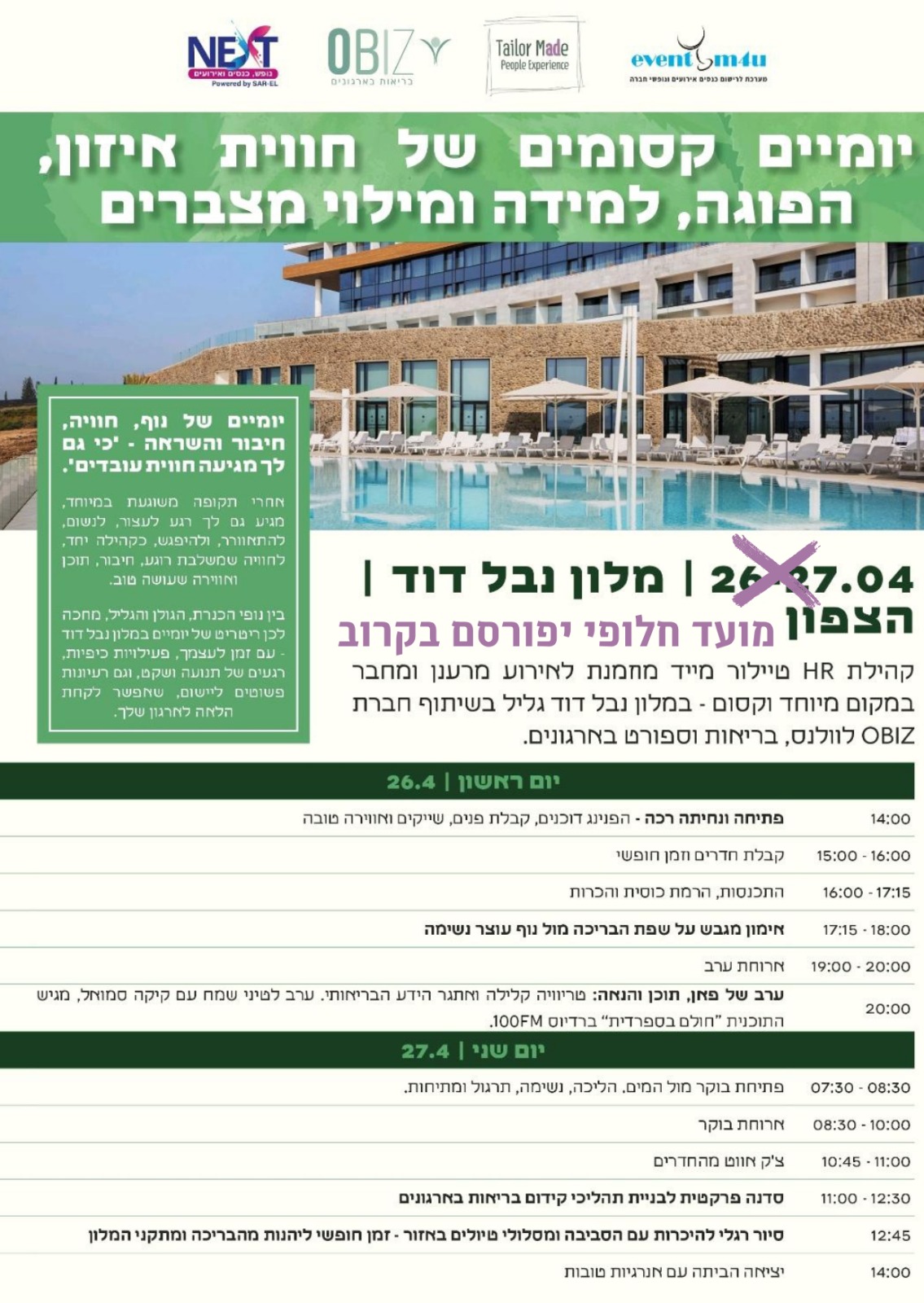* יש לשלוח לדני: שם מלא, שם ארגון, כמות עובדים, עם מי בחדר, איך מגיעים אוטובוס/ עצמאי, רגישויות אוכל.