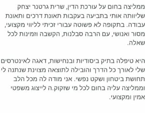 שרית מלווה את העובד לאורך התהליך, נותנת מענה לשאלות ומפחיתה עומס ופניות מהארגון, תוך הקפדה על ליווי רגיש וברור.